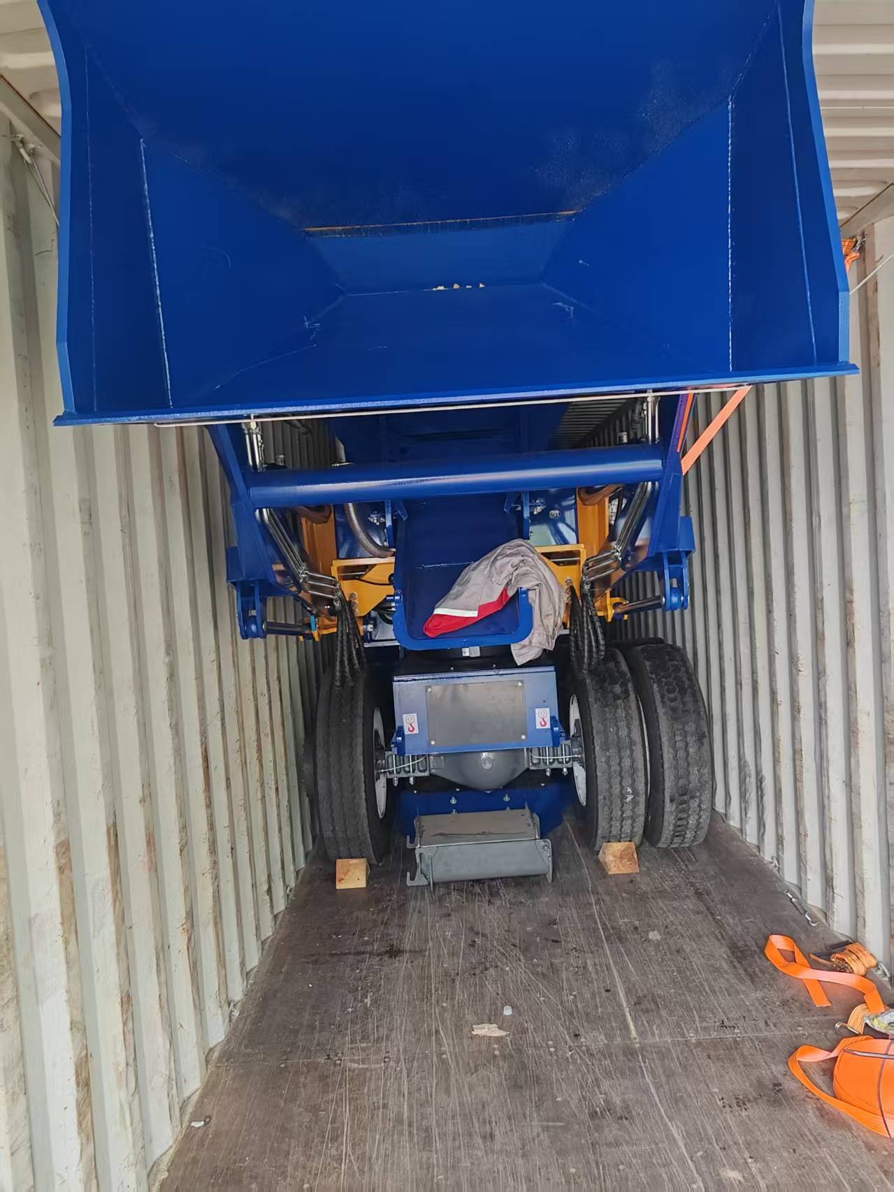 Hoy hemos cargado en el contenedor un mezclador de concreto de 3.5 m³ con destino a África. Para colocarlo en un contenedor de 40 pies, fue necesario desmontar una rueda, la cabina y algunas otras partes. Cada componente fue reforzado y asegurado minuciosamente para garantizar la seguridad y evitar daños durante el transporte.