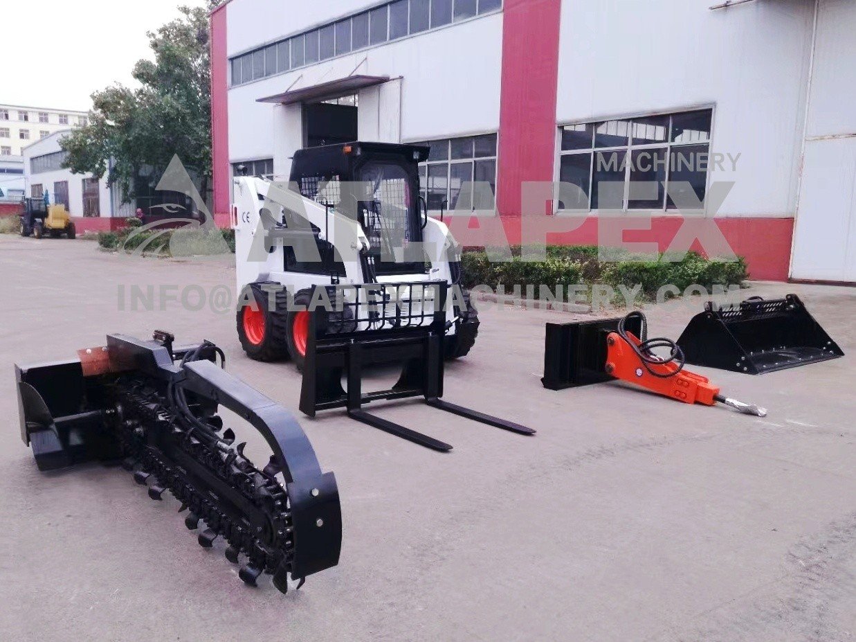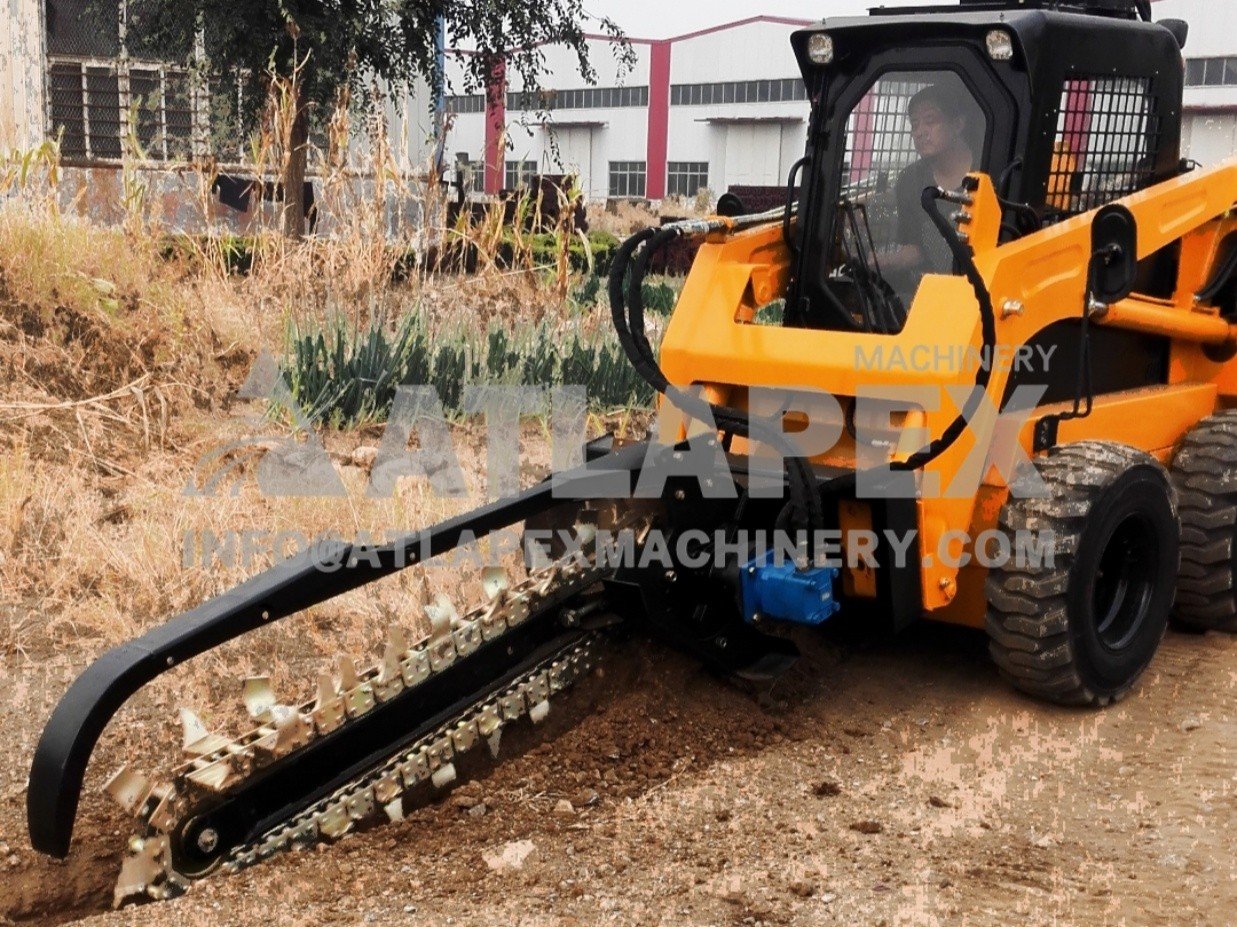 La minicargadora con zanjadora ATLAPEX es un nuevo dispositivo de zanjación eficiente y práctico. El motor diésel transmite la rotación a través de una correa al embrague, que acciona la caja de cambios móvil, el eje motriz, el eje trasero, etc., para lograr el movimiento lineal hacia adelante o hacia atrás de la zanjadora de cadena.